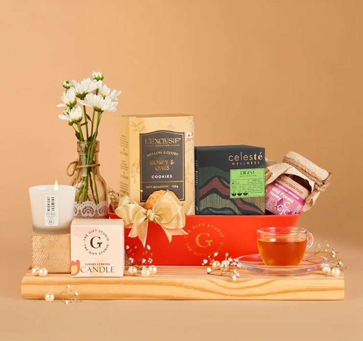 Enjoy cozy evenings with the Sip & Share Surprise set, thoughtfully curated for relaxing moments. This collection features 200g of Conscious Wild Forest Organic Honey, 150g of L’Exclusif CTC Lemon Grass Tea, and 150g of Smoor Oats & Cranberry Cookies, all elegantly arranged on a compact 10x10x5-inch red tray. A 14-hour Shot Jar Candle adds warmth and ambiance. Store the items in a cool temperature to preserve their quality and freshness, making this set ideal for quiet, indulgent tea times.